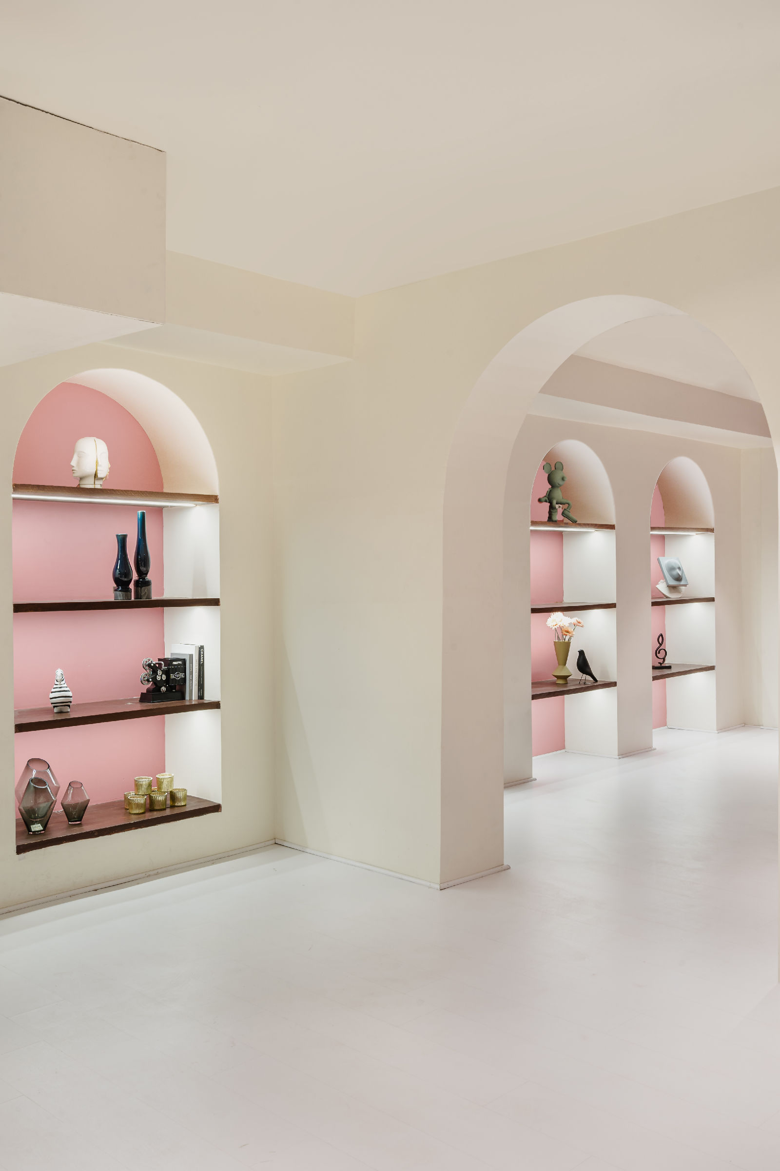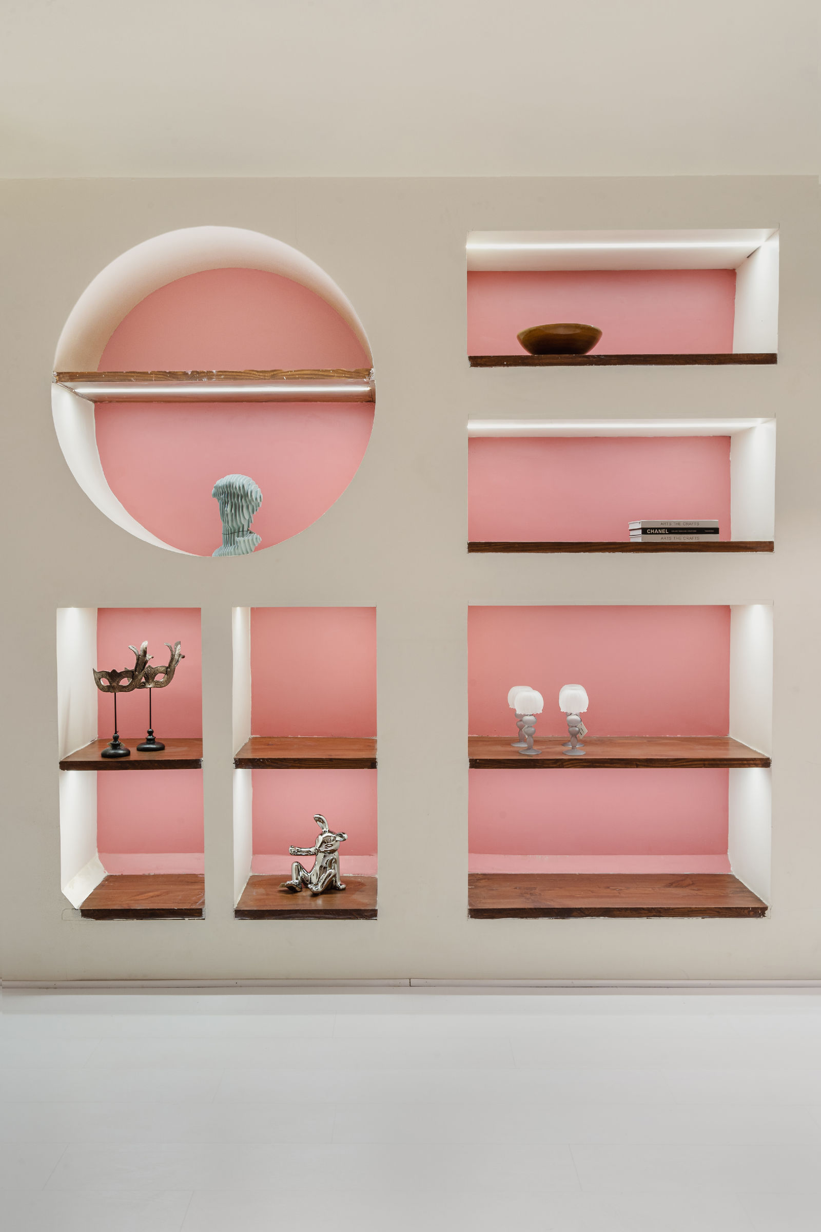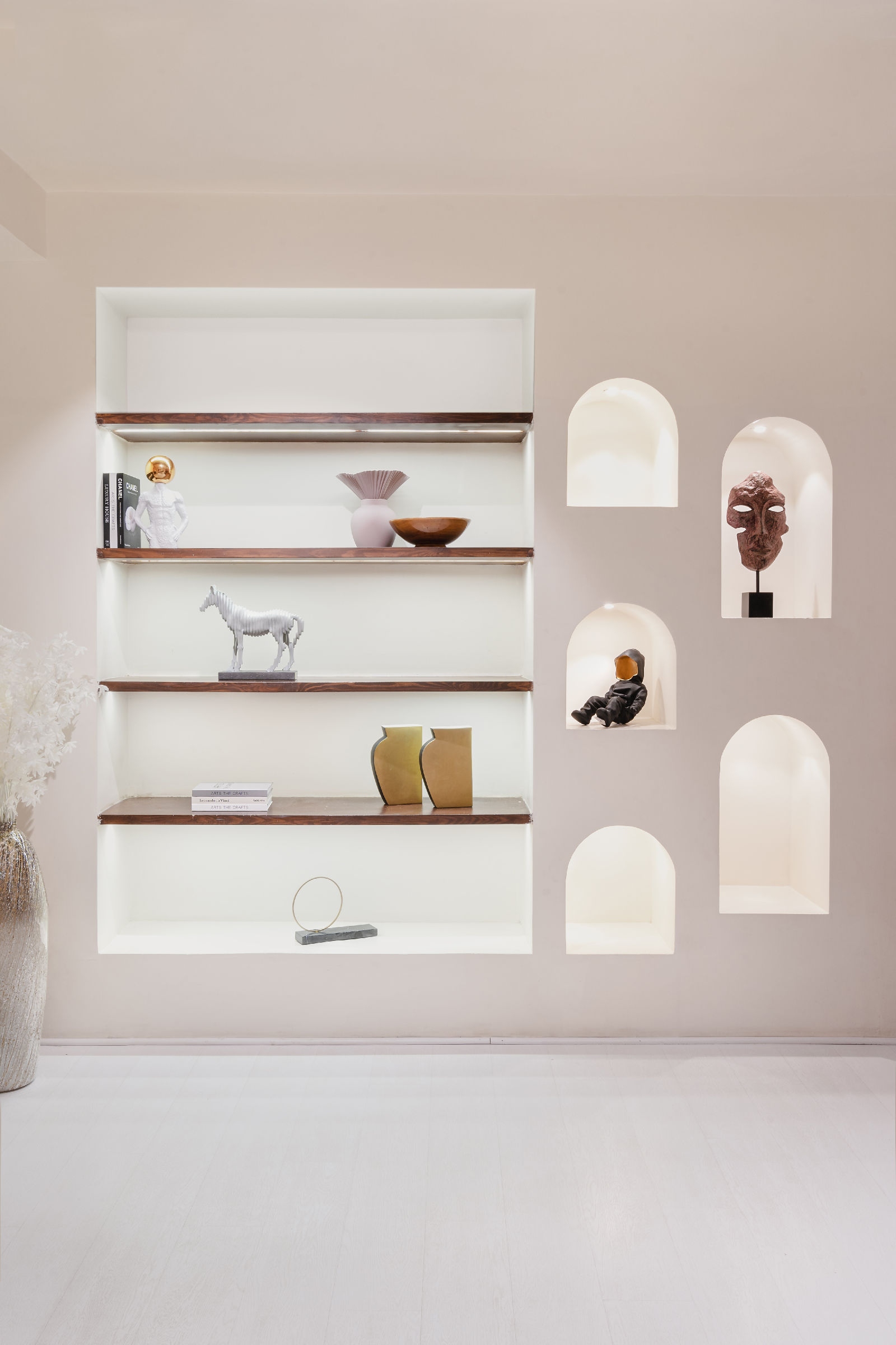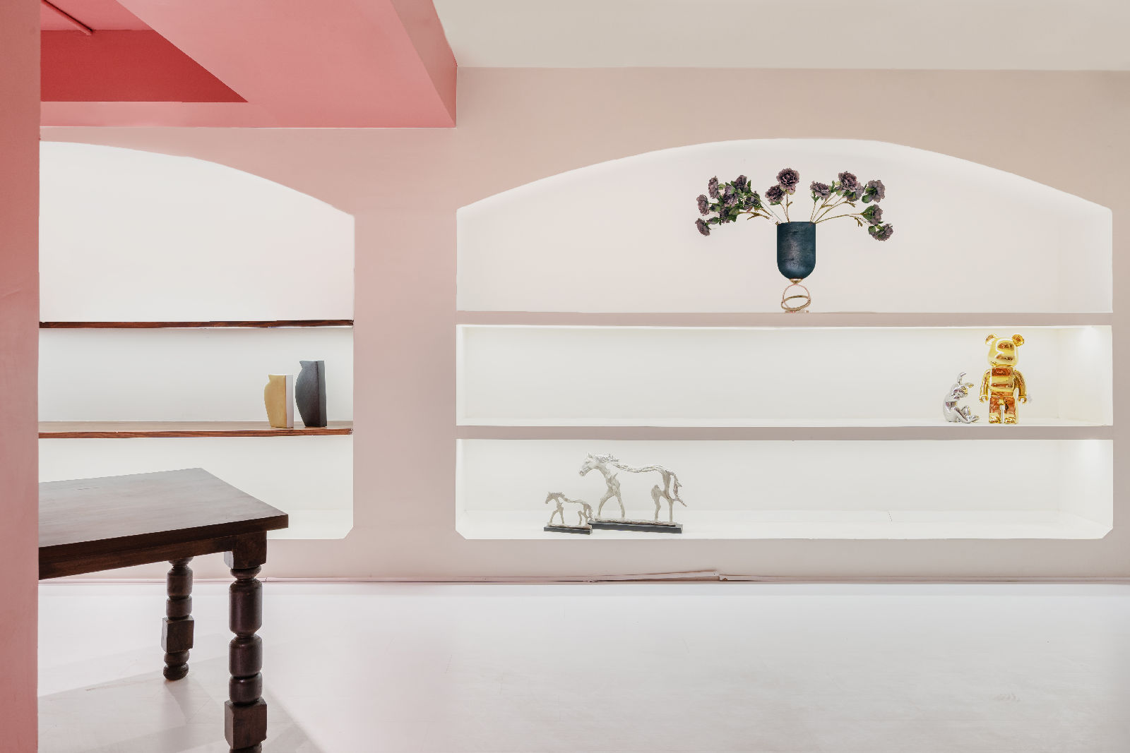 A contemporary interior where structural pillars became sculptural statements, paired with arches, curves, and layered textures for a uniquely fluid design.