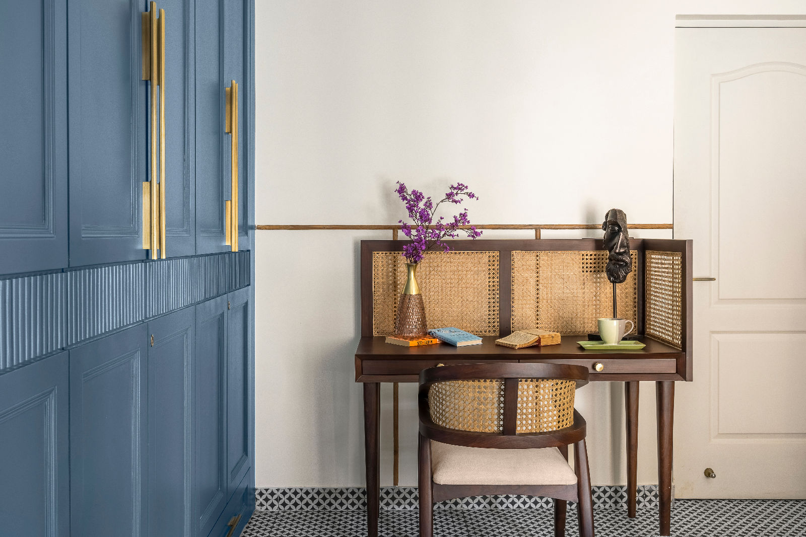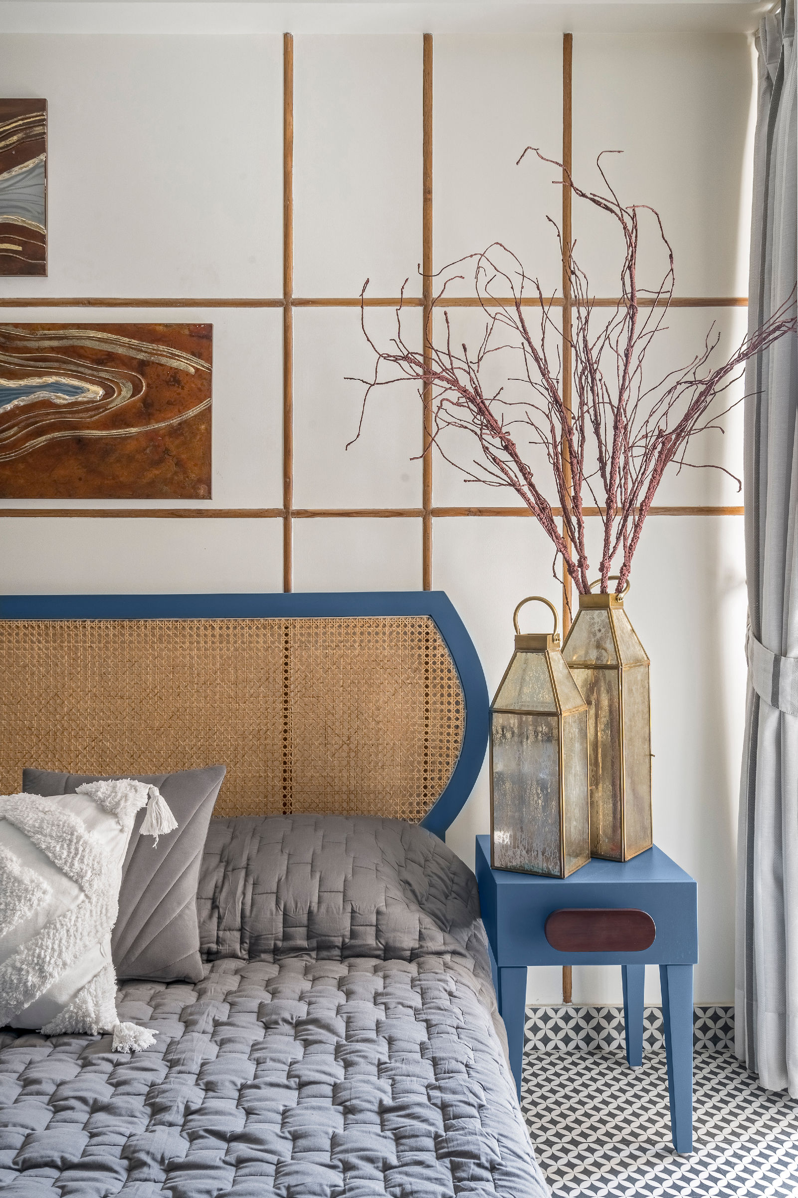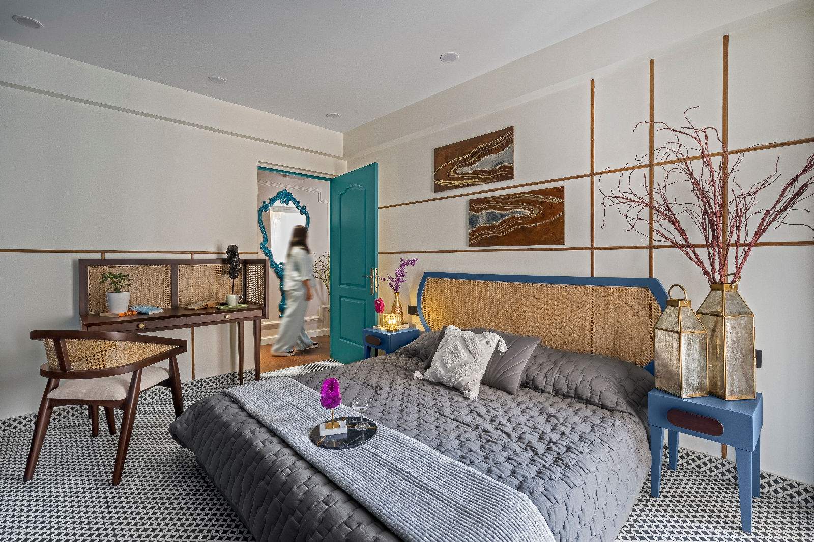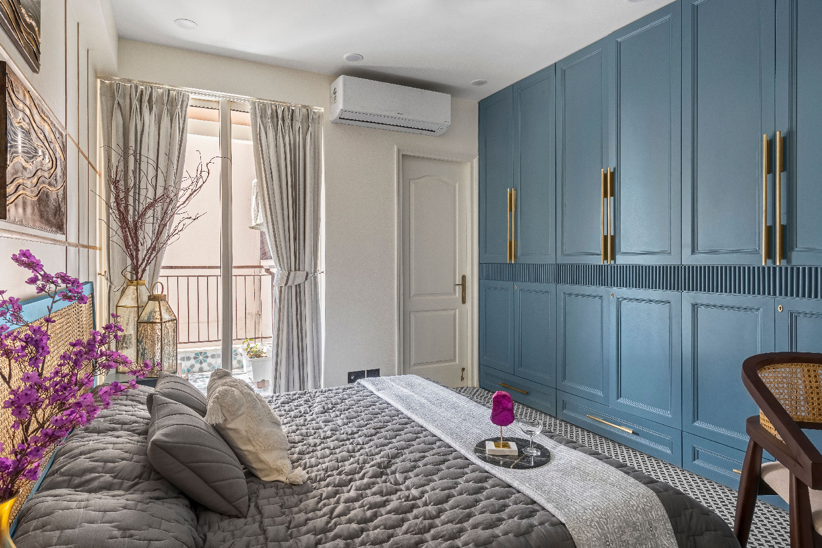 We introduced Moroccan tiles in the kitchen, guest bedroom, and balconies, bringing an artisanal charm and a playful textural layer to the modern boho mood. As trusted interior decorators in Gurgaon, we curated flooring patterns that align with home interior design Gurgaon standards, enhancing both warmth and narrative throughout the home.