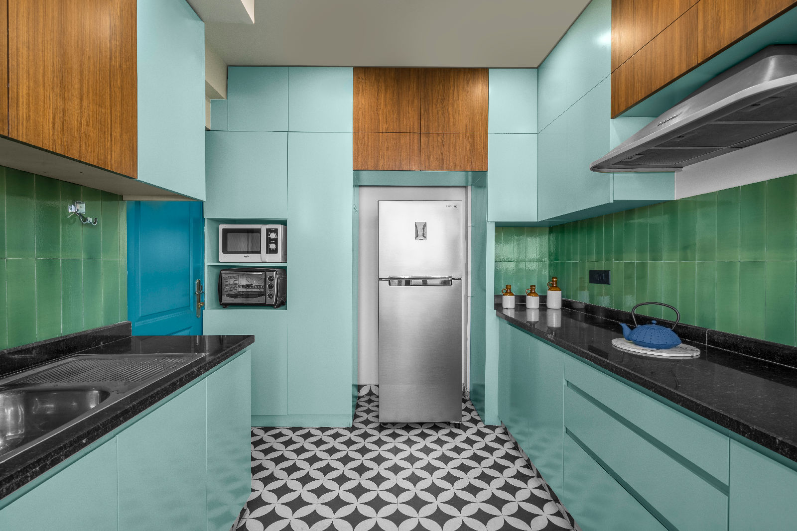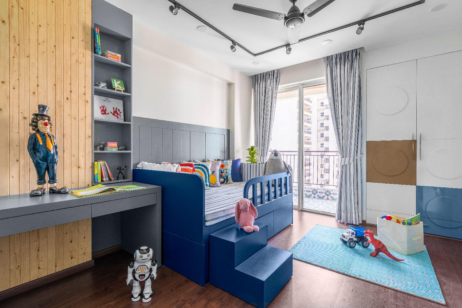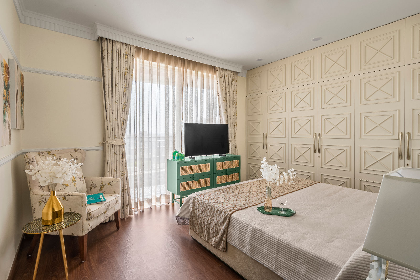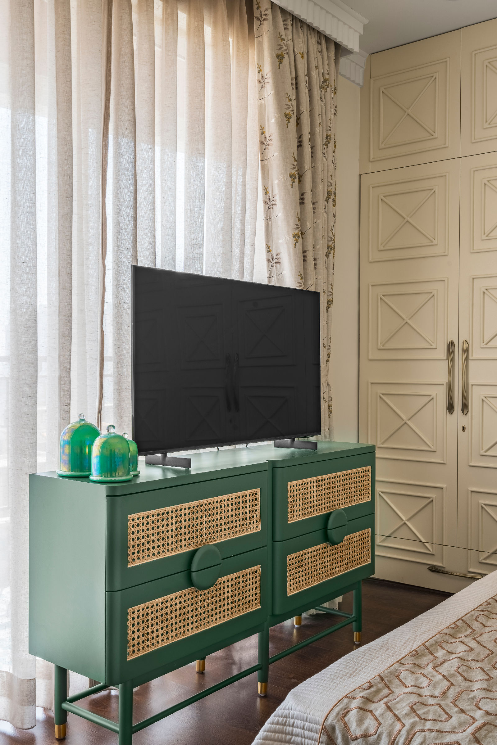 We introduced Moroccan tiles in the kitchen, guest bedroom, and balconies, bringing an artisanal charm and a playful textural layer to the modern boho mood. As trusted interior decorators in Gurgaon, we curated flooring patterns that align with home interior design Gurgaon standards, enhancing both warmth and narrative throughout the home.