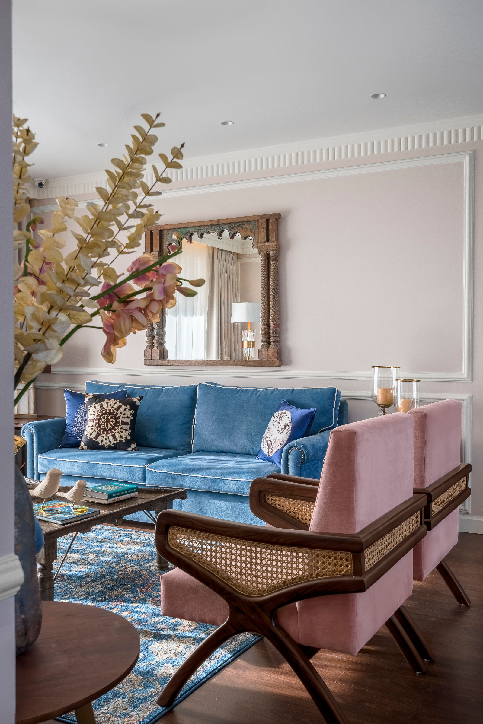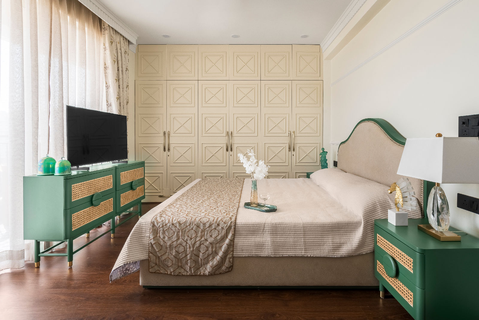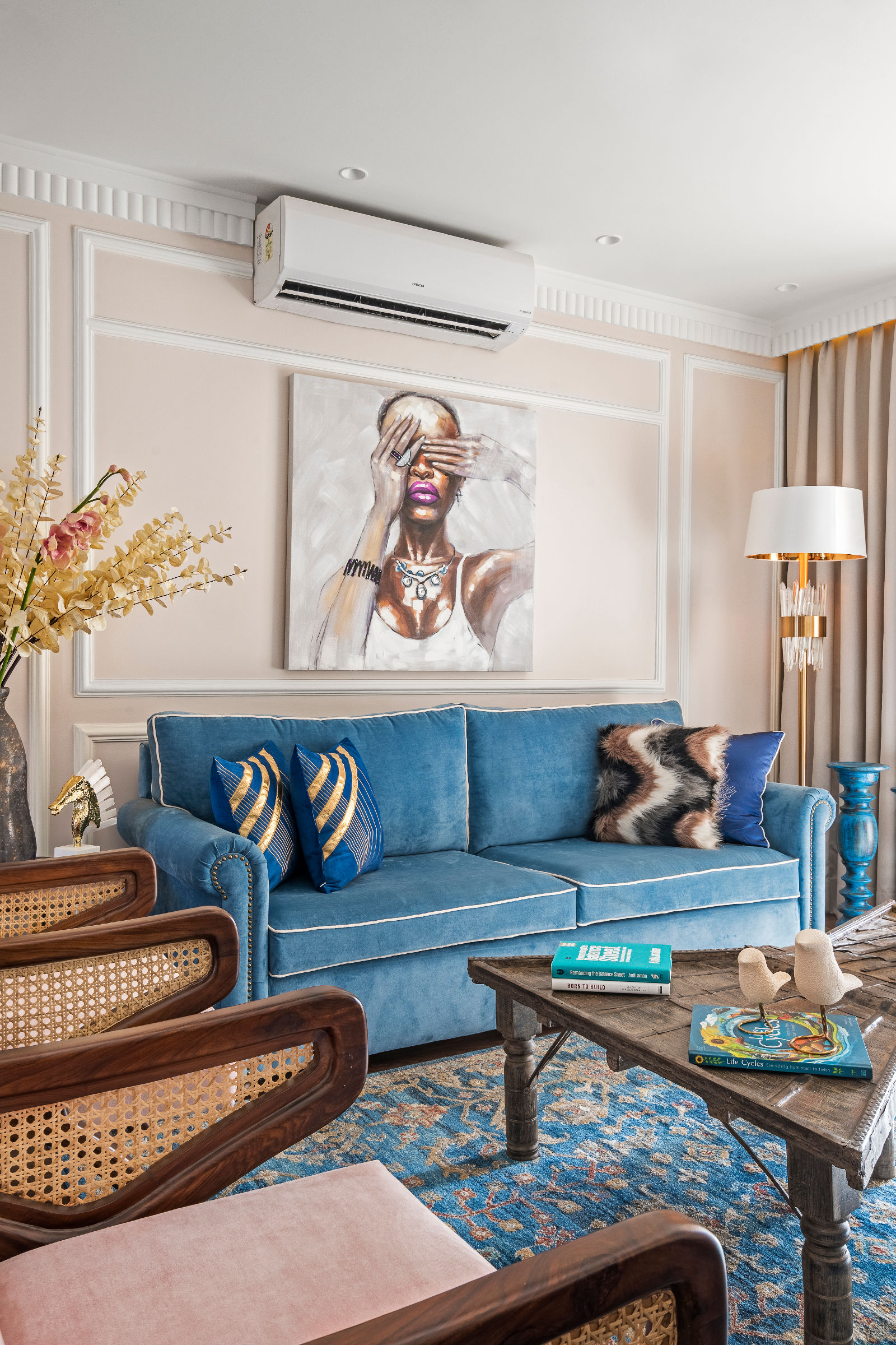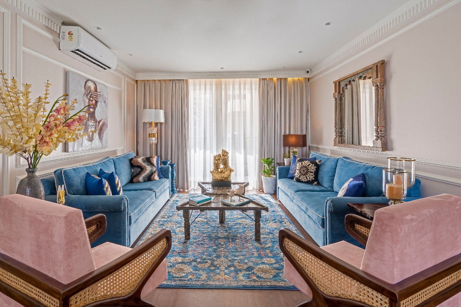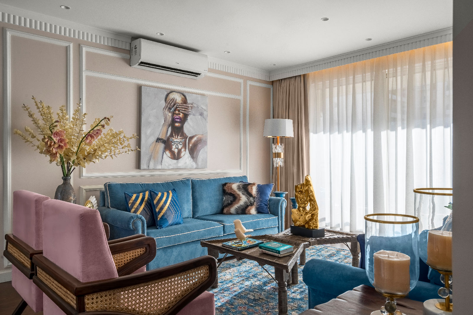 In this 4,000 sq. ft. four-bedroom residence, we began with multiple furniture layouts and presentations to ensure functionality, balance, and comfort before finalizing the modern boho direction. Our expertise in luxury living room decor allowed us to craft visually rich yet functional spaces, reflecting refined interior designing in Gurgaon standards and thoughtful Gurgaon interior design that prioritises lifestyle, movement, and personal comfort.