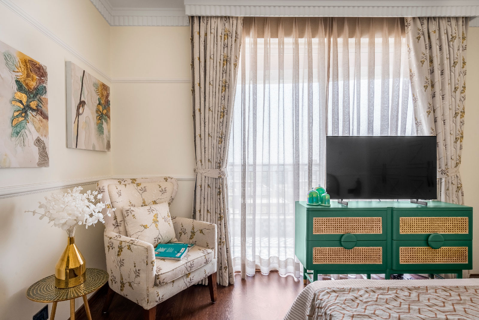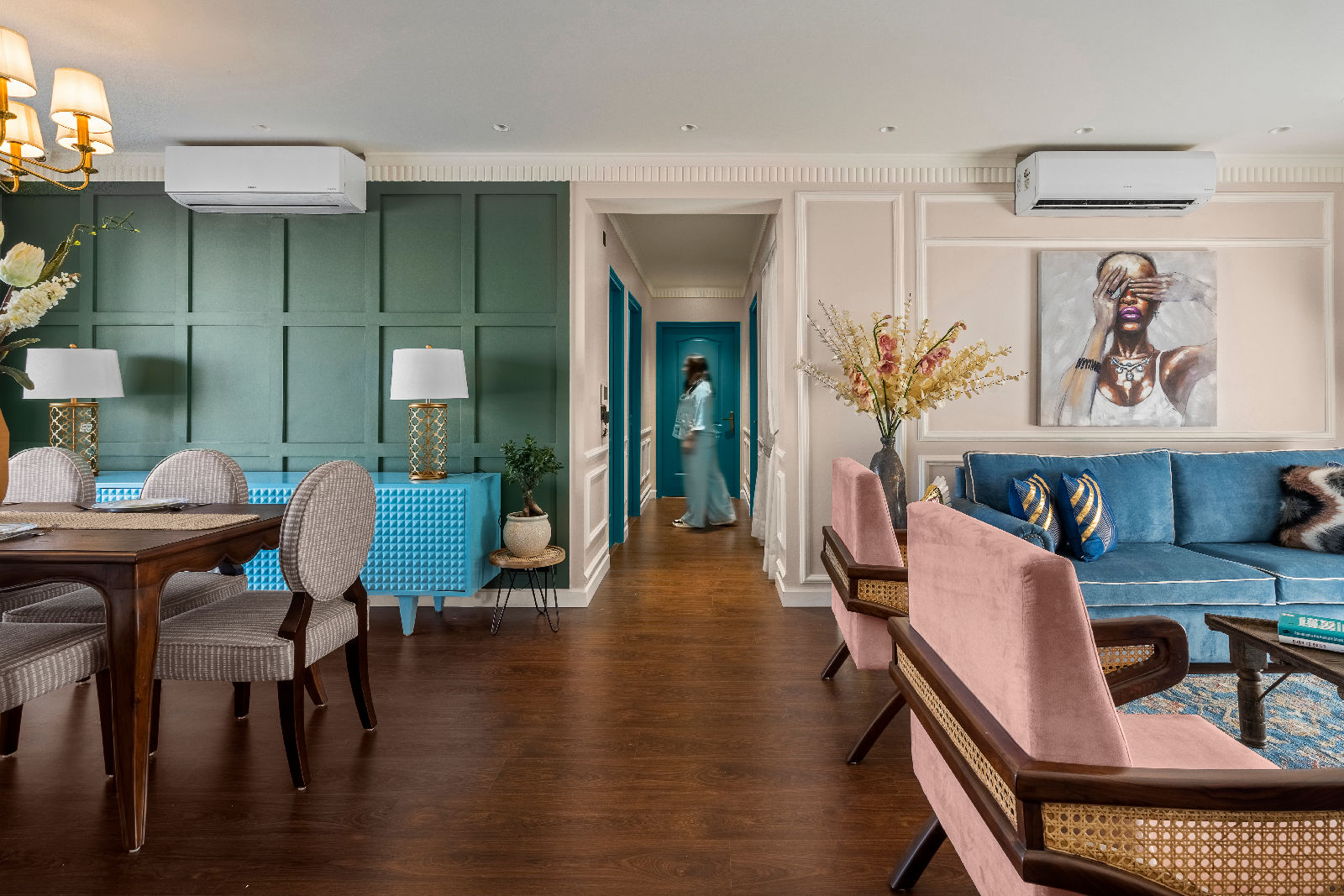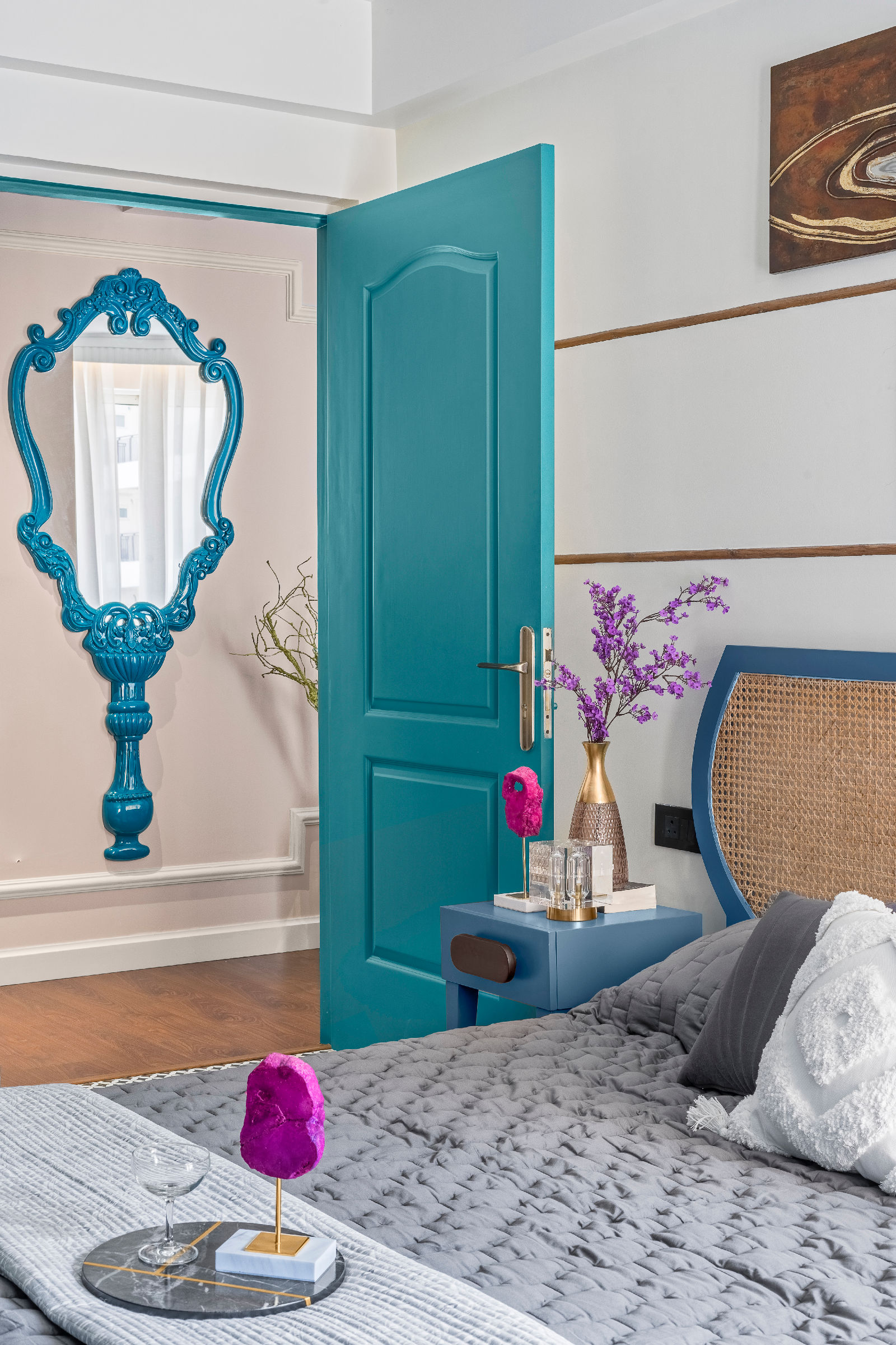 We embraced a modern boho aesthetic — a rich mix of bold colors, eclectic details, and natural textures, offering a relaxed yet stylish atmosphere throughout the home. The design captures the essence of luxury living room decor, blending artistry with function while elevating the identity of modern Gurgaon interior design practices.