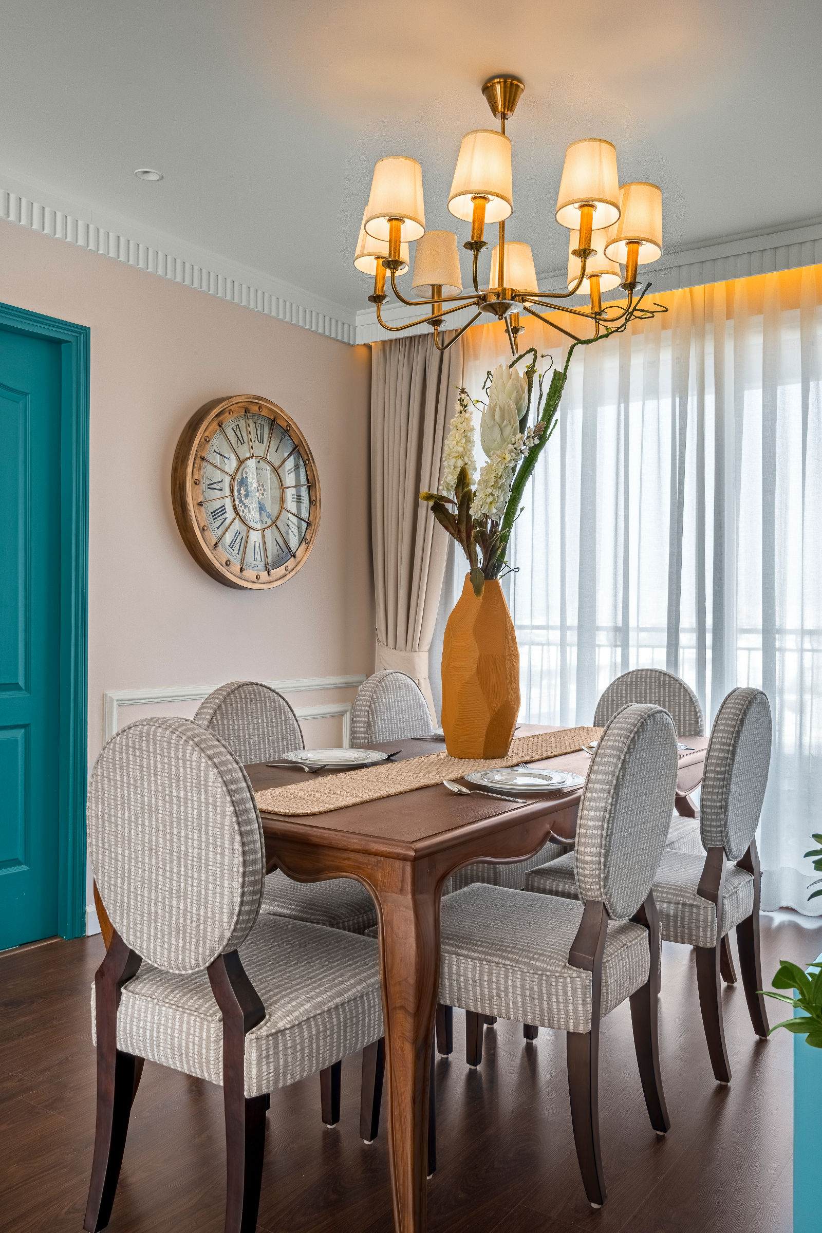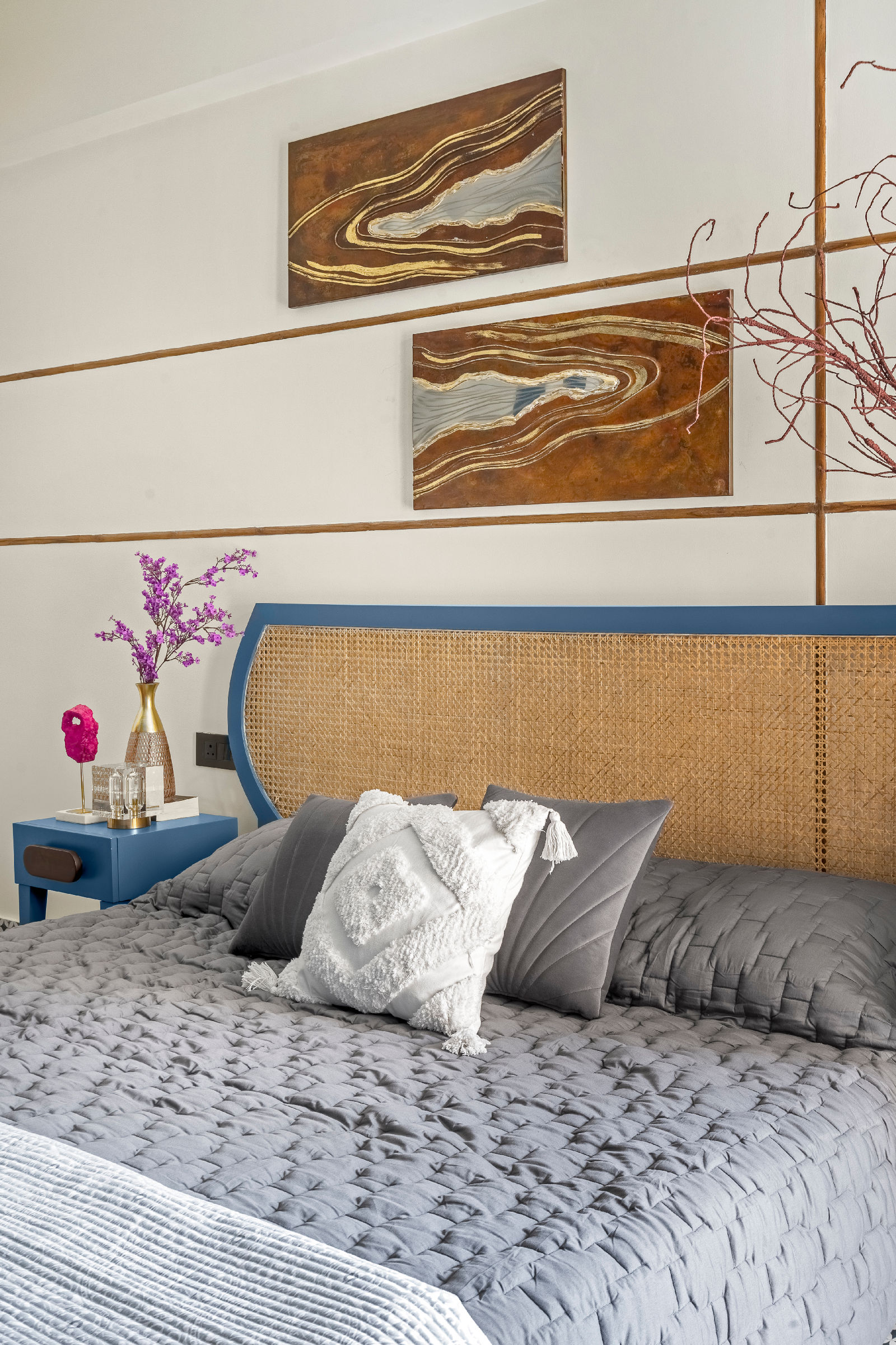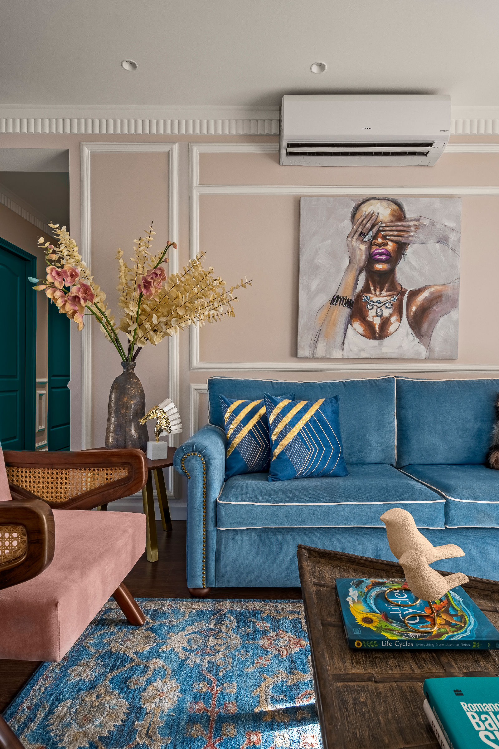 We embraced a modern boho aesthetic — a rich mix of bold colors, eclectic details, and natural textures, offering a relaxed yet stylish atmosphere throughout the home. The design captures the essence of luxury living room decor, blending artistry with function while elevating the identity of modern Gurgaon interior design practices.